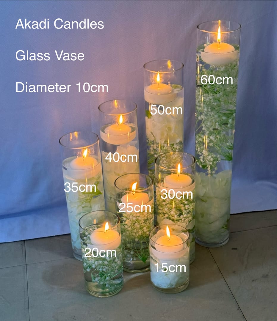 To rent our empty cylinder vases, call or WhatsApp 0507610089. Akadi Candles is ready to support your event décor needs across Ghana.